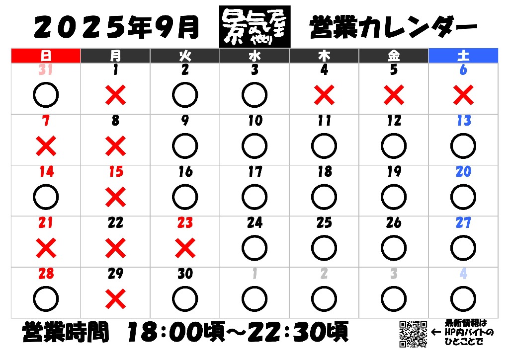更新9月営業カレンダー