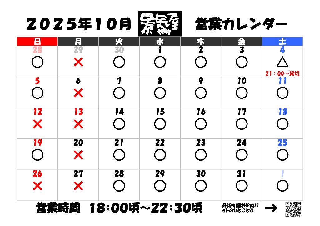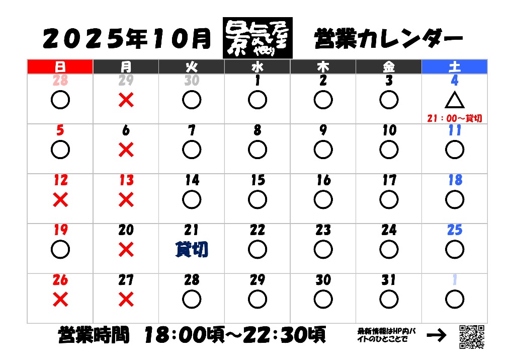 10月営業カレンダー更新