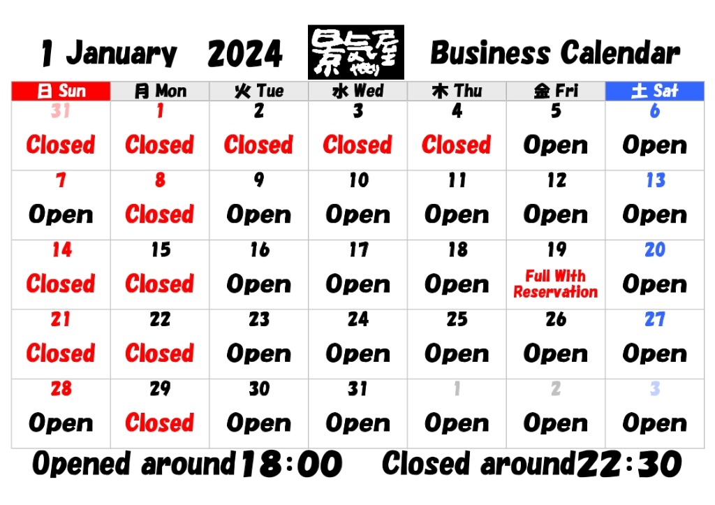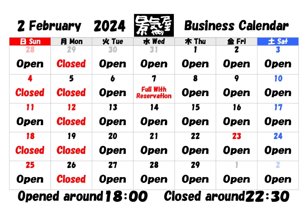 さて、2月の営業日をご案内いたします。
