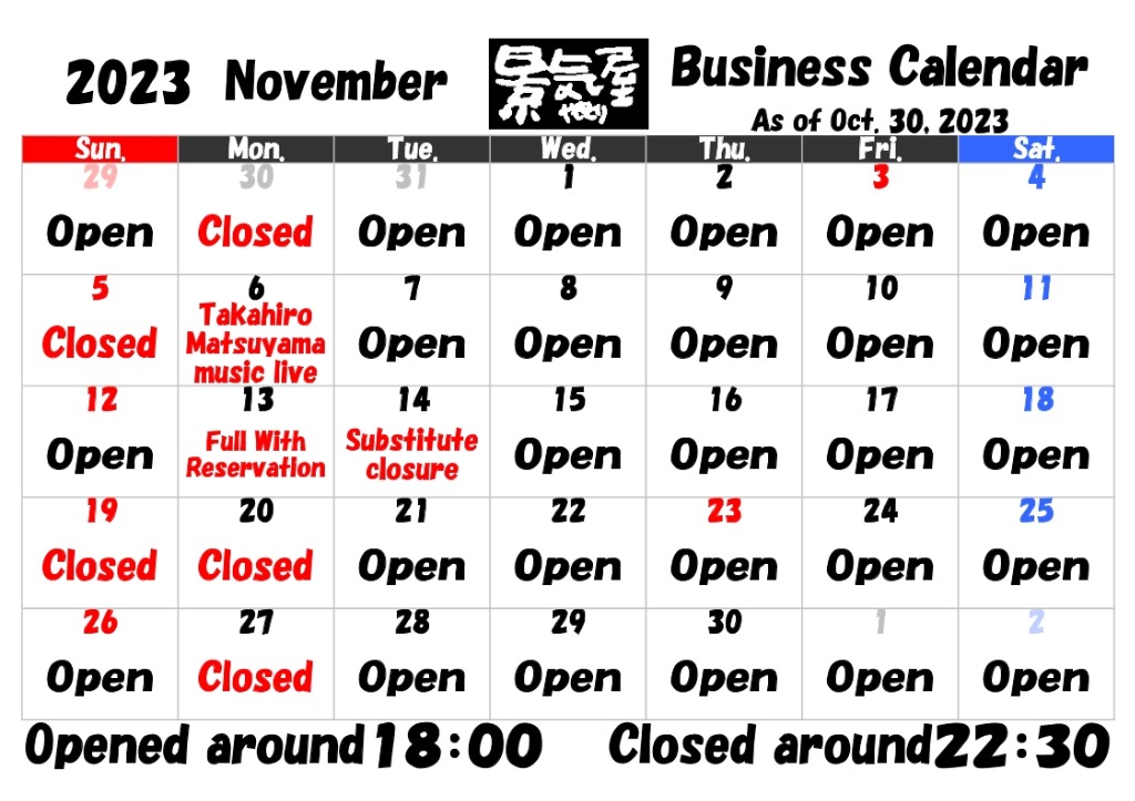 さて、11月の営業日が確定しました。