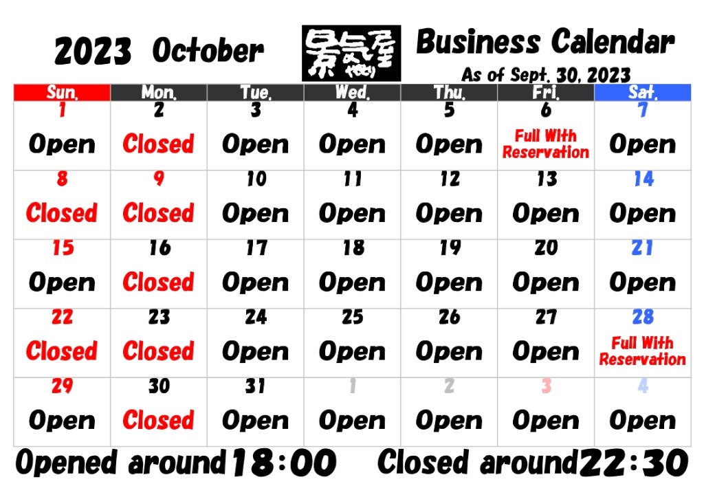 10月営業カレンダー